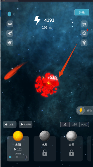 4、持續(xù)點(diǎn)擊天體可快速積累資源,當(dāng)資源足夠時可進(jìn)行升級操作,提升資源獲取速度,加速游戲進(jìn)程。