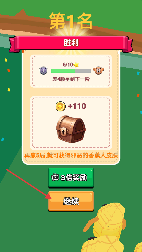 4、獲得第1名勝利后,點擊【繼續(xù)】按鈕領(lǐng)取獎勵,繼續(xù)挑戰(zhàn)以解鎖邪惡的香蕉人皮膚。