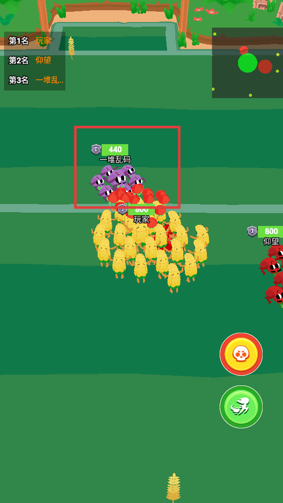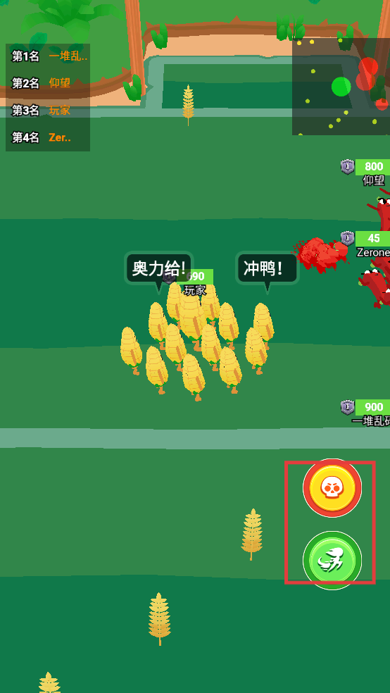 2、對戰(zhàn)中利用右側(cè)的技能按鈕,合理釋放攻擊技能,壯大自身蔬菜隊伍。