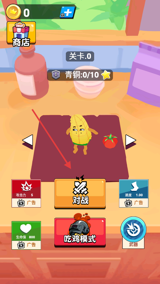1、在關(guān)卡界面,點擊【對戰(zhàn)】按鈕進入競技模式,開始蔬菜對戰(zhàn)挑戰(zhàn)。