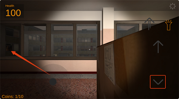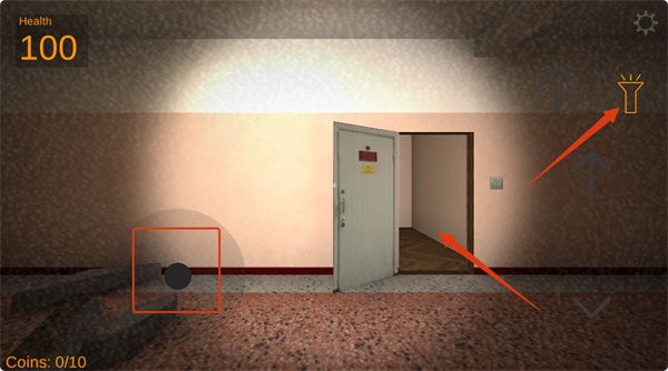 2、游戲中注意左上角的【Health-100】和【Coins-0/10】,點擊右側(cè)手電筒圖標可照明,通過左側(cè)控制區(qū)域移動,探索開啟的房門。