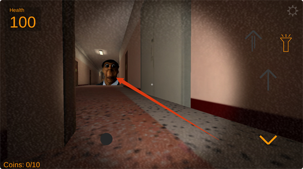 4、遇到走廊中的怪異角色時,保持警惕,利用移動控制避開,注意【Health-100】和硬幣收集進度,確保自身安全并完成收集任務(wù)。