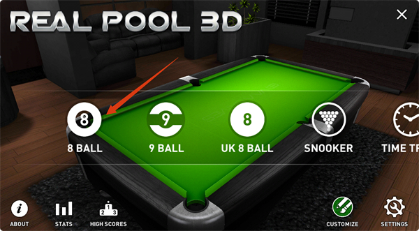 1、進(jìn)入游戲后,選擇【8BALL】模式開始游戲。