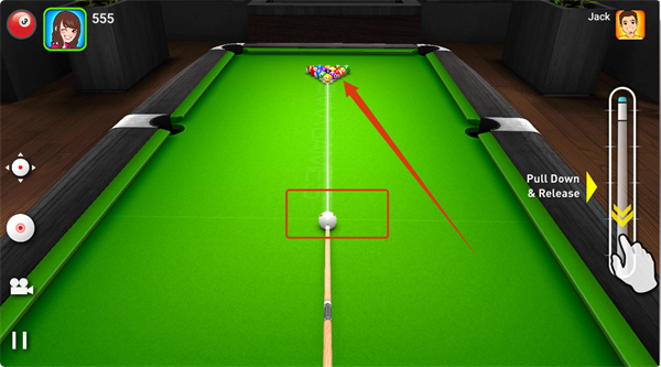 3、開球時(shí)瞄準(zhǔn)球堆,按照提示【PullDown&Release】控制球桿力度,擊打母球,開啟臺(tái)球?qū)郑⒁馇虻臄[放位置和擊球角度。