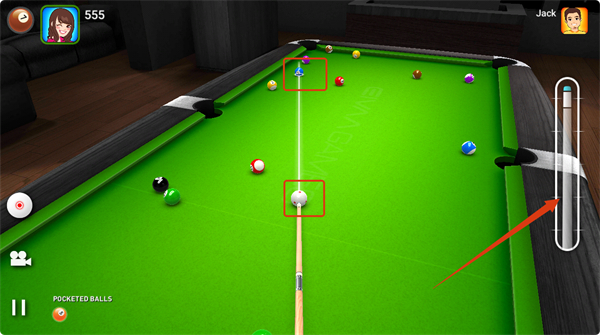 4、對(duì)局中瞄準(zhǔn)目標(biāo)球,調(diào)整球桿力度,擊打母球以將目標(biāo)球打入袋中,注意觀察球的運(yùn)動(dòng)軌跡,合理規(guī)劃擊球策略,推進(jìn)游戲進(jìn)程。
