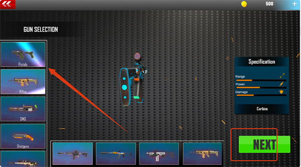 2、在武器選擇界面,選擇合適的槍械,如【Pistols】,查看其【Specification】屬性,點擊【NEXT】繼續(xù)游戲。