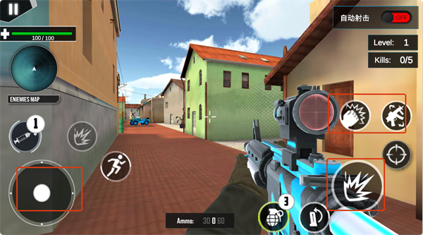 3、戰(zhàn)斗中利用左側(cè)虛擬搖桿移動,右側(cè)功能按鈕攻擊,注意【自動射擊】開關(guān)和殺敵數(shù),合理利用技能推進關(guān)卡。