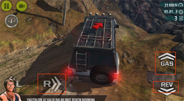 2、利用右側(cè)【GAS】和【REV】按鈕控制車速,左側(cè)【R】按鈕調(diào)整方向,注意燃油表和行駛時間,合理操控車輛。