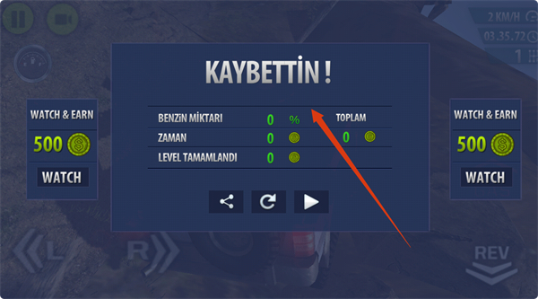 4、若任務(wù)失敗,可點擊重試按鈕,總結(jié)失敗原因,調(diào)整駕駛策略,關(guān)注燃油和時間,提升駕駛技巧以完成關(guān)卡。