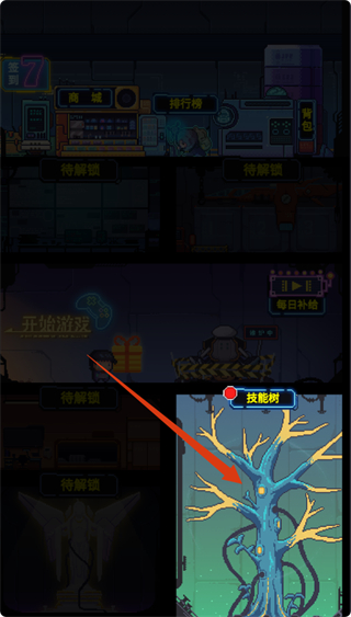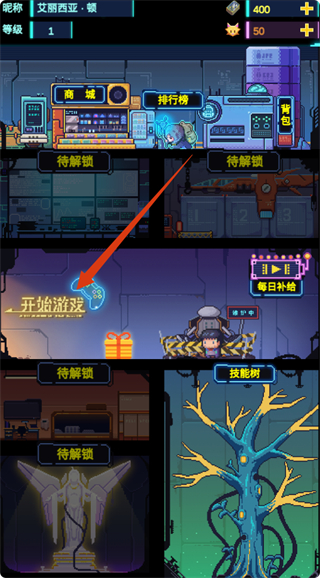 1、進(jìn)入游戲后,可先查看【商城】【排行榜】【技能樹】等功能,了解游戲界面布局。