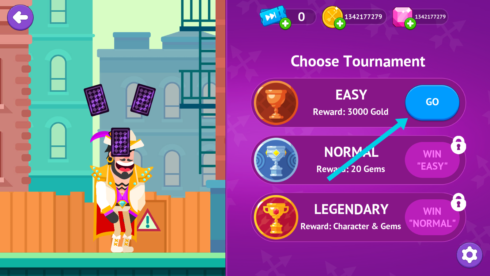 1、先選【EASY】錦標(biāo)賽,點(diǎn)擊【GO】開(kāi)啟挑戰(zhàn),贏了能拿3000金幣,還能解鎖更高難度模式,新手這樣起步很穩(wěn)妥哦。