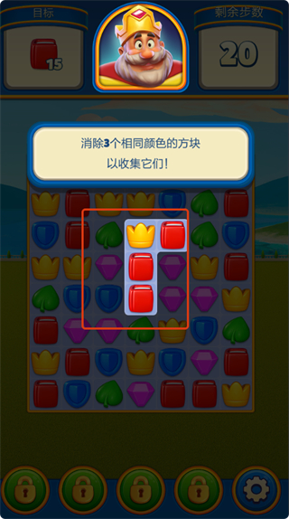 1、游戲開(kāi)始時(shí),根據(jù)提示消除3個(gè)相同顏色的方塊,如紅色方塊,注意剩余步數(shù)和目標(biāo)數(shù)量,逐步收集方塊。