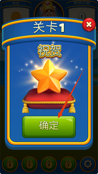 4、關(guān)卡完成后,點(diǎn)擊【確定】按鈕進(jìn)入下一關(guān),總結(jié)本關(guān)策略,為后續(xù)關(guān)卡的消除操作做好準(zhǔn)備。
