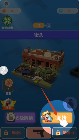 1、點(diǎn)擊【開始】按鈕進(jìn)入游戲,可先查看【幸運(yùn)轉(zhuǎn)盤】【任務(wù)】等功能,了解游戲界面布局。