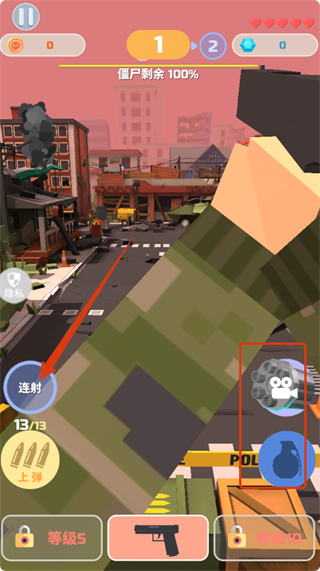 2、戰(zhàn)斗中利用【連射】功能攻擊僵尸,注意右側(cè)的道具按鈕,合理使用道具提升戰(zhàn)斗效率,關(guān)注僵尸剩余比例。