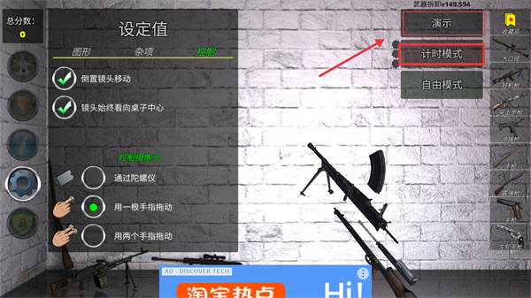 1、進入游戲先設(shè)置控制方式,可以選擇【演示】【【計時模式】等控制選項,為槍械分解挑戰(zhàn)做好準備。